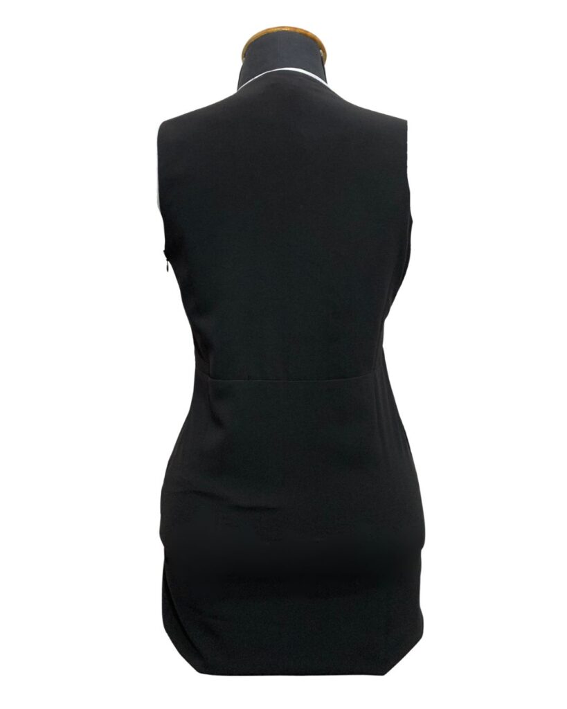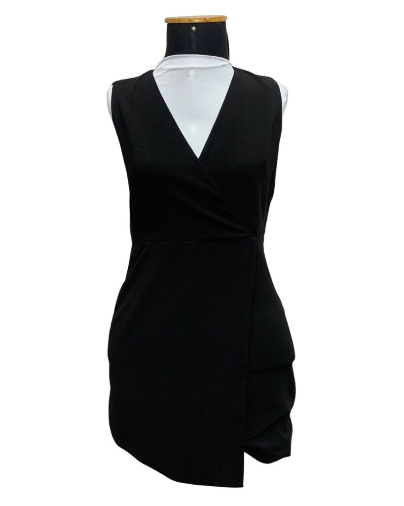 Vestido preto curto, moderno e elegante, com design transpassado na parte frontal que valoriza a silhueta. Sem mangas e com decote em “V”, oferece um visual sofisticado e versátil, ideal para eventos noturnos, festas ou ocasiões especiais. Sua modelagem assimétrica adiciona um toque fashion, garantindo estilo sem perder o conforto. Perfeito para quem busca uma peça chic e atemporal.