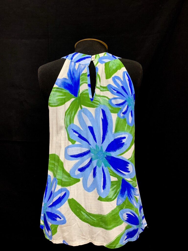 Tamanho: 44 (G). A Blusa Summer Garden é pura leveza, cor e frescor. Com estampa floral em tons vibrantes de azul e verde, ela traz um visual alegre e cheio de personalidade — perfeito para os dias mais quentes.